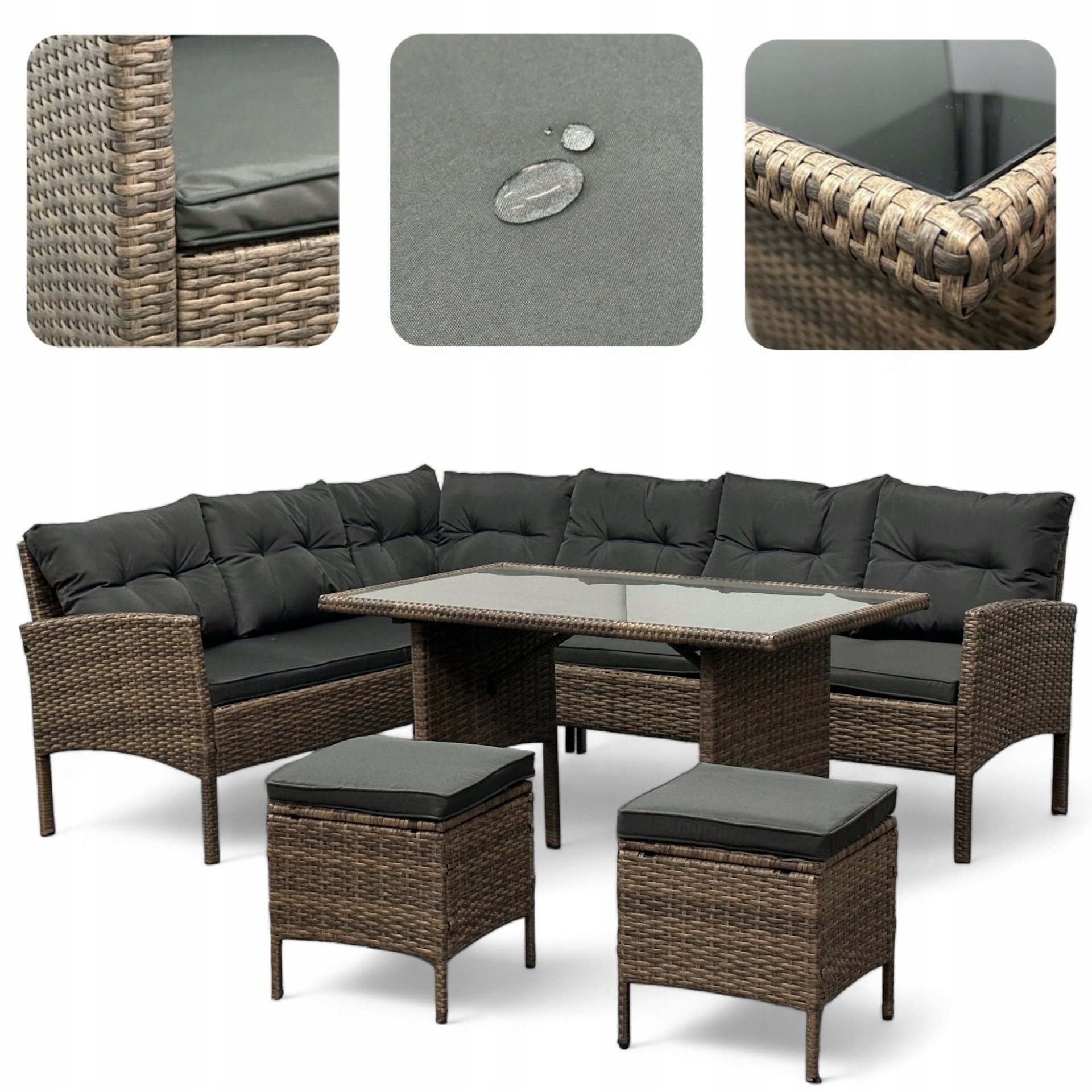 ZESTAW KOMPLET MEBLI OGRODOWYCH SFS079 MTG NAROŻNIK TECHNORATTAN JASNY BRĄZ Zawartość zestawu narożnik puf stół